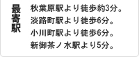 秋葉原駅より徒歩約3分、淡路町駅より徒歩6分、小川町駅より徒歩6分、新御茶ノ水駅より5分です。